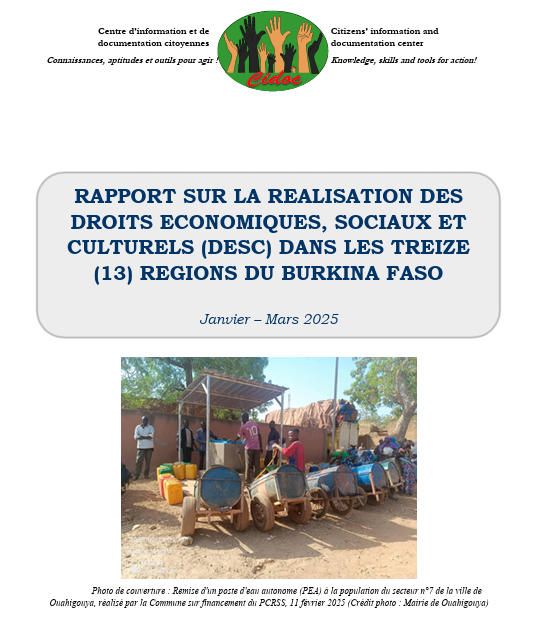 La période de janvier à mars 2025 s’inscrit dans un contexte où le Burkina Faso continue de faire face à des défis sécuritaires et humanitaires. Cette instabilité a particulièrement accentué les inégalités d’accès aux services sociaux de base, tels que l’éducation, la santé, l’eau et l’assainissement, rendant l’engagement des autorités et des acteurs de la protection des droits humains plus crucial que jamais. Œuvrant pour la promotion des droits humains, le Centre d’information et de documentation citoyennes (Cidoc) a créé un environnement d’expression citoyenne et de synergie d’action dans le cadre du projet « Renforcer l’effectivité du droit de contrôle citoyen de l’action publique (CCAP) relative aux droits économiques, sociaux et culturels (DESC) comme moyen de résilience démocratique au Burkina Faso », en abrégé ‘Projet CCAP-DESC’. Ce projet est mis en œuvre en collaboration avec la Commission Nationale des Droits Humains (CNDH) et avec l’appui du projet « Promotion des Droits Humains, de la Paix et de la Cohésion sociale 2021-2025 » (DHPCS), dans une perspective de participation citoyenne, à travers le contrôle citoyen du domaine que le gouvernement a manifestement priorisé, à savoir le développement socioéconomique.